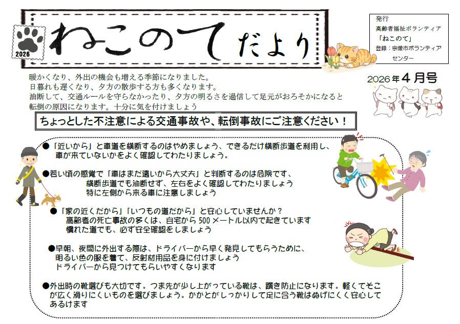 高齢者福祉ボランティア「ねこのて」さんより、ねこのてだより4月号が届きました。 3月末~4月はお花見の季節ですね。 暖かい日が多くなりましたが、朝晩はやはりちょっと肌寒く感じます。 体調には充分注意したいものです。 今月は交通安全に関しての内容です! ねこのてだよりは 宗像市ボランティアセンター メイトム宗像1階掲示板に 掲載・設置しています。 ご自由にお持ち帰りください。